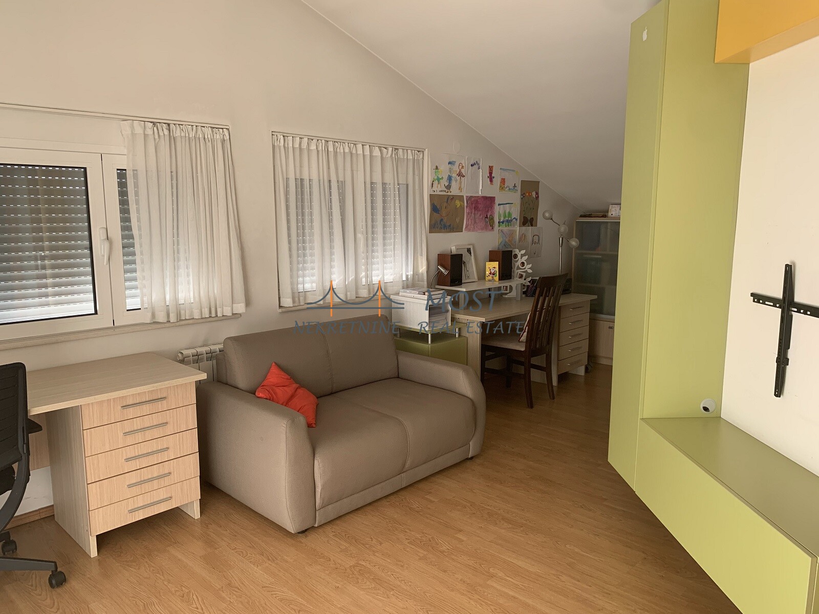 Iznajmljivanje Izdaje se namještena kuća u naselju Donja Gorica. Kuća je površine 240 m2 i raspolaže sa sledećim sadržajima: u prizemlju se nalazi prostrana dnevna soba, kuhinja sa trpezarijom, kupatilo i jedna spavaća soba dok su na spratu smještene tri spavaće sobe, master soba sa kupatilom i garderoberom i jedno zajedničko kupatilo. Dnevnu sobu krasi kamin. Kuća ima suteren u kome se nalazi vešeraj, kupatilo, ostava i radionica, a tu je smejštena i kotlarnica za centralno grijanje kojim se napaja cijela kuca i koje je na pelet. Kuća je klimatizovana i ima video nadzor i sistem aalarma za potpunu bezbijednost. Kuća se nalazi na kultivisanom placu od 650 m2, sa mnoštvom sadnica raznih vrsta voća, kao i visokom zelenom ogradom i kapijom koja je na daljinsku kontrolu. Dvorište ima automatski sistem za navodnjavanje. Pored kuće nalazi se i pomoćni objekat koji služi kao ostava a u klopu dvorišta je i natkriveni prostor za parking do šest automobila. Kuća će bit slobodna 25.05.2025.godine