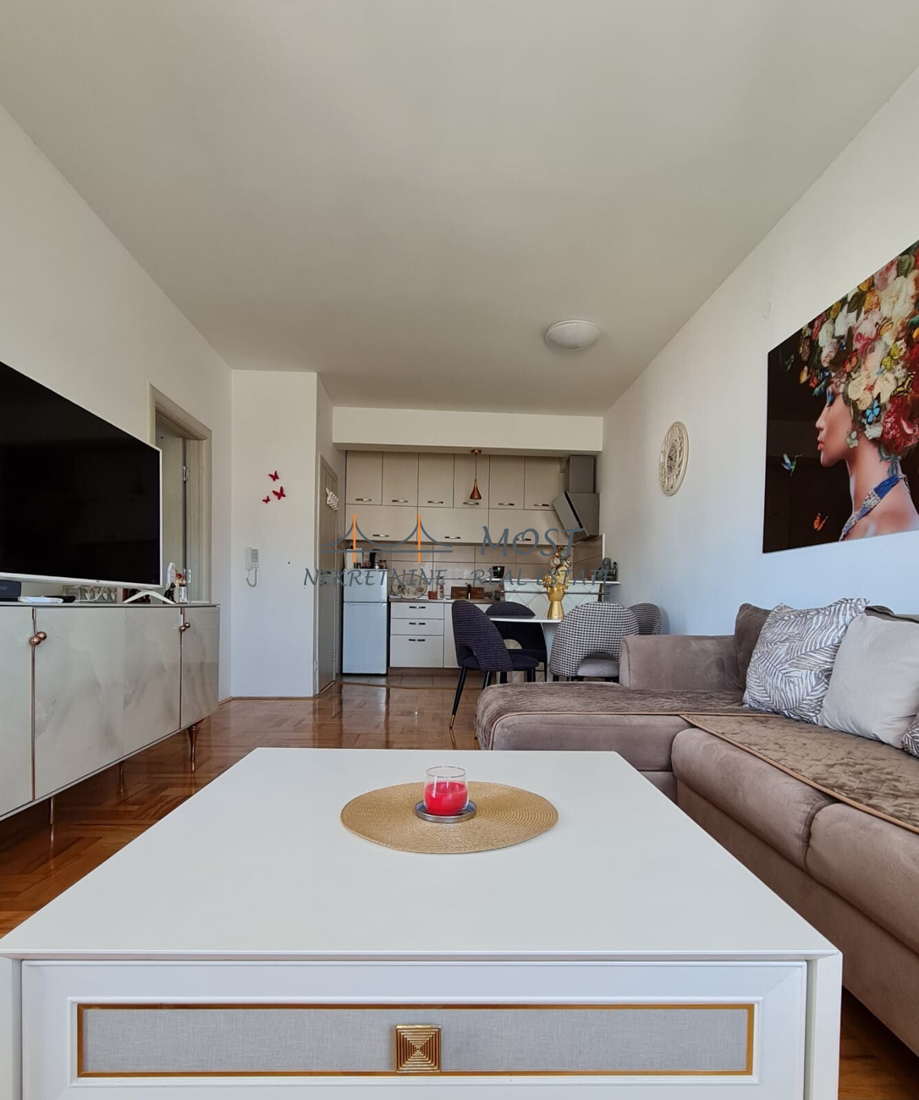 Prodaja Prodaje se lijepo namješten jednosoban stan od 49 m2 ispod brda Ljubovica. Strukturu stana čine: ulazni hodnik, kuhinja sa trpezarijom, dnevni boravak,spavaća soba, kupatilo i lijepa terasa.