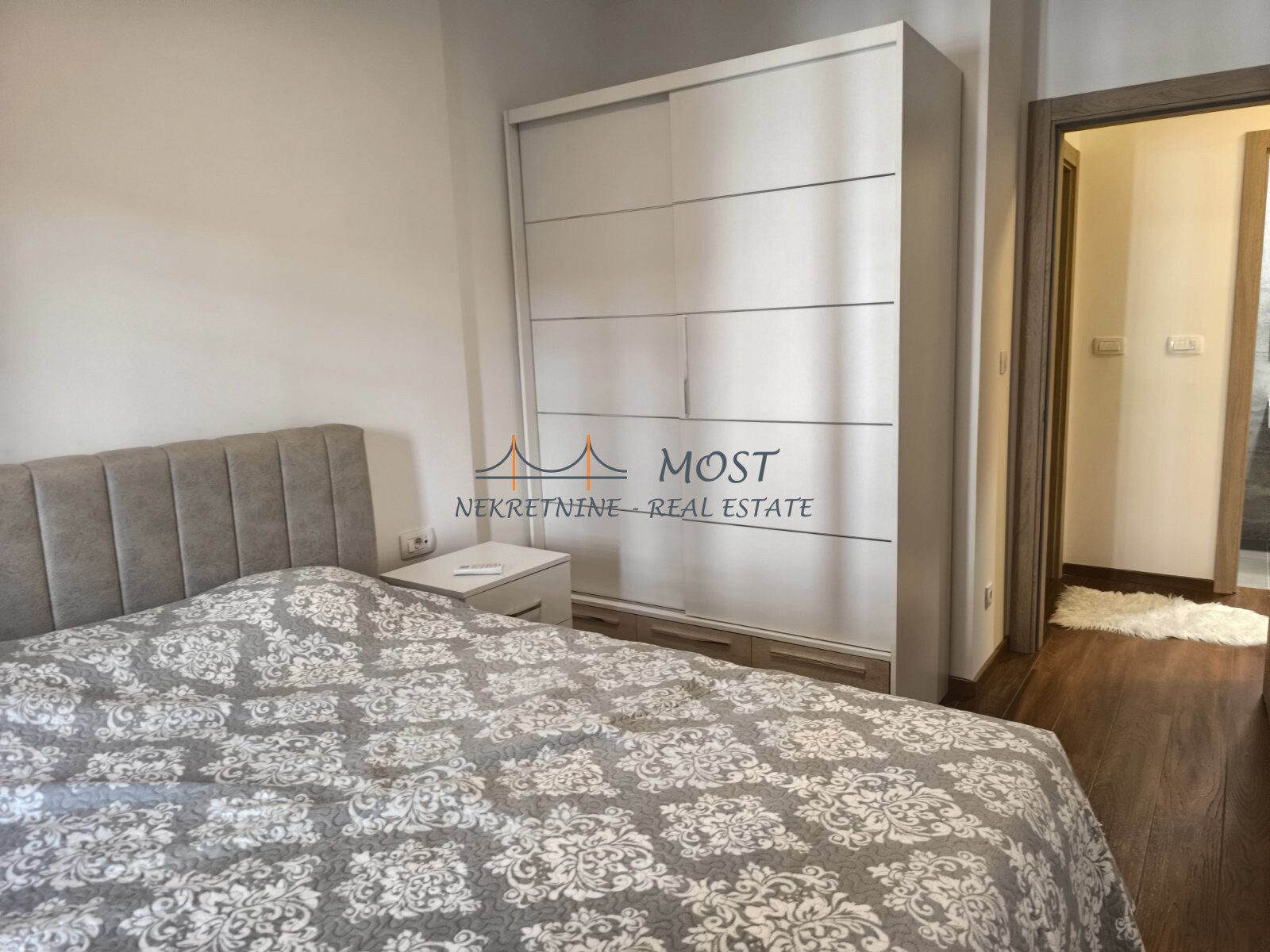 Iznajmljivanje Izdaje se luksuzno namješten dvosoban stan u Master kvartu. Stan je smješten na trećem spratu zgrade koja ima dva lifta. Zauzima površinu od 70 m2 i sledežeg je rasporeda: ulazni hodnik, dnevna soba sa trpezarijom i kuhinjom, terase, dvije spavaće sobe i dva kupatila. Stan je klimatizovan i udoban za stanovanje, opremljen modernim namještajem i sa puno detalja. U cijenu zakupa uračunato je parking mjesto u garaži. Stan je sunčan i prozračan, orijentisan ka zapadu.