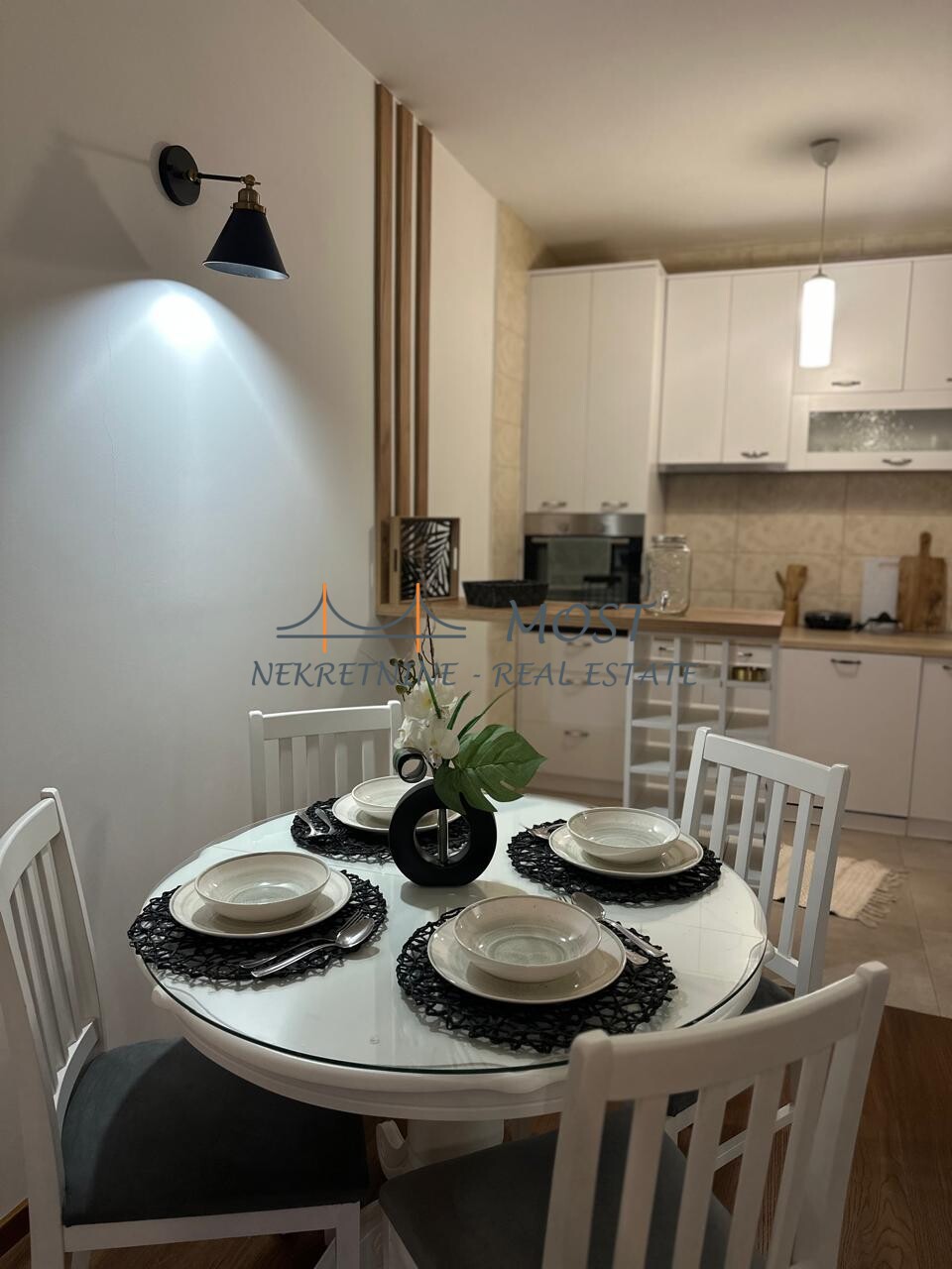Izdato Izdaje se lijepo opremljen stan u Master kvartu, površine 53 m2. Stan sadrži ulazni hodnik, dnevnu sobu sa kuhinjom i trpezarijom, spavaću sobu i terasu. Stan se nalazi na osmom spratu.