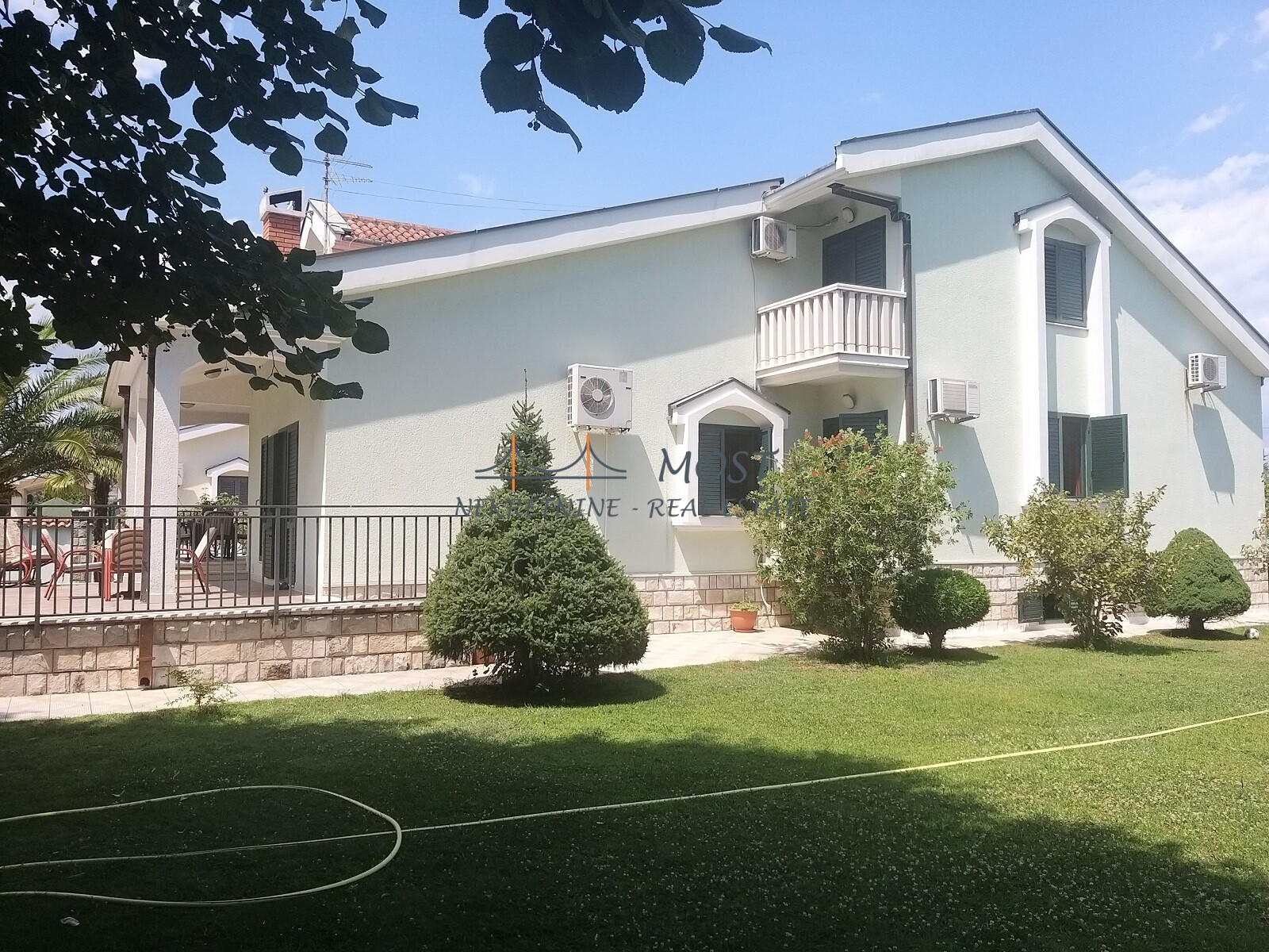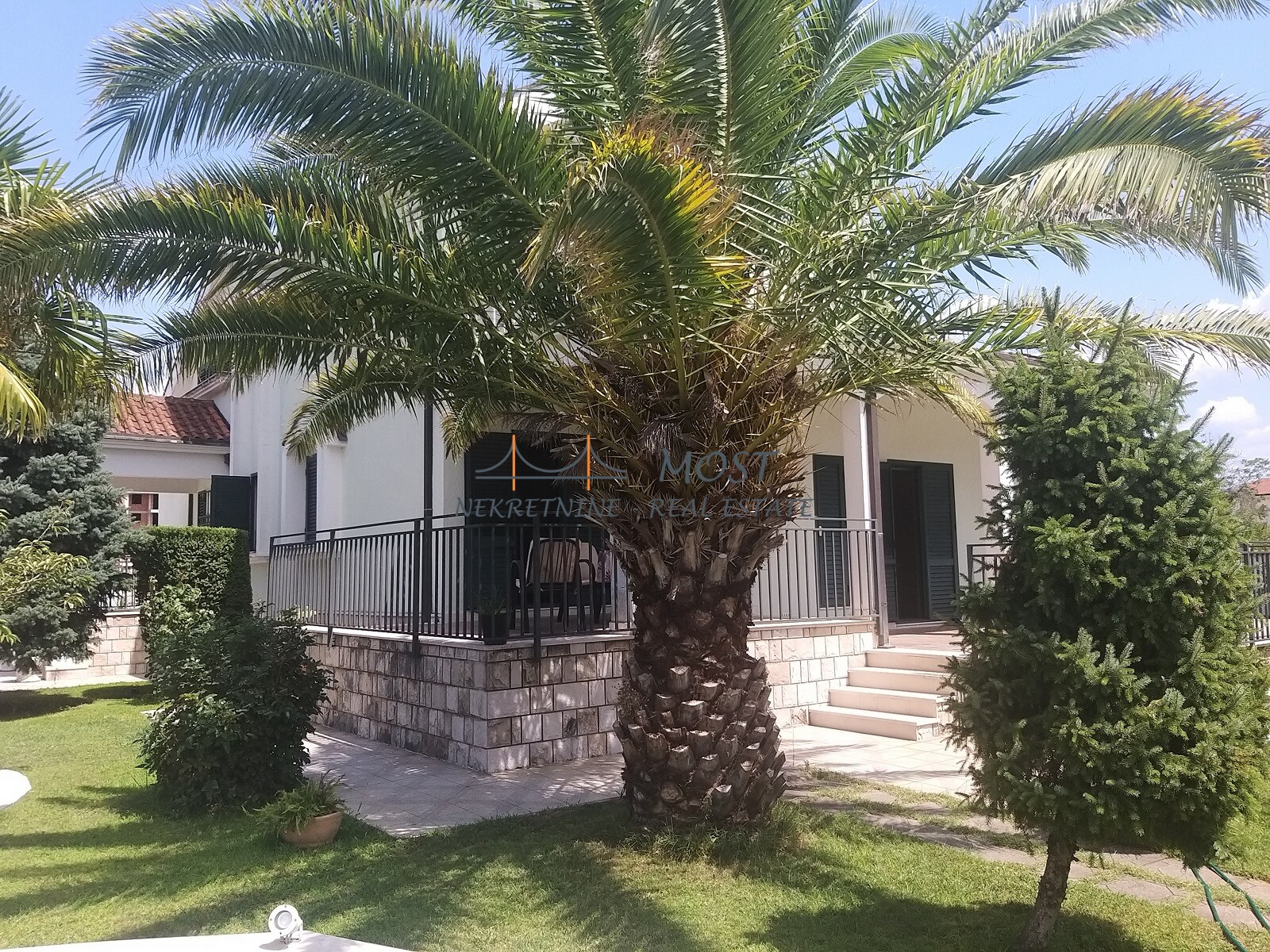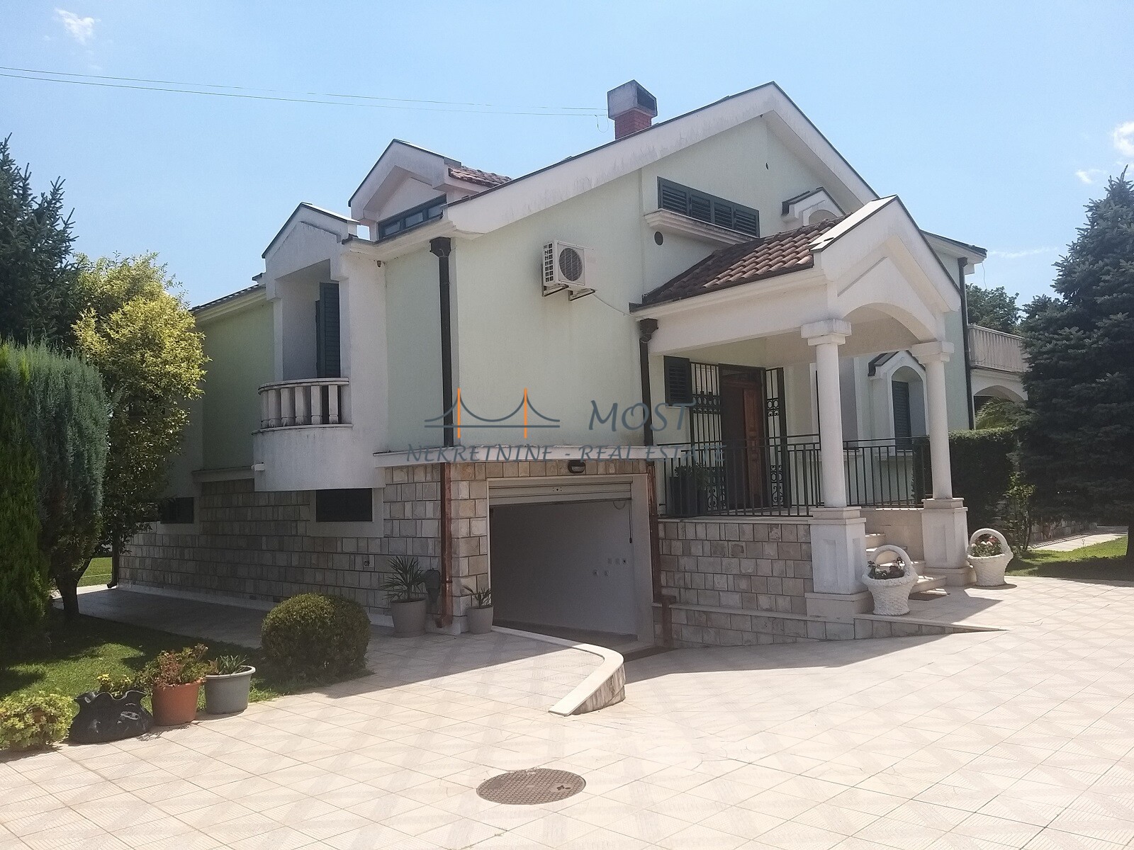 Izdato Kuća se nalazi na Zabjelu, u neposrednoj blizini Rocky Pistolata i bivše Internacionalne škole. Kuća je površine 350 m2, ima suteren, prizemlje i sprat. U prizemlju kuće nalazi se prostrani dnevni boravak sa kaminom, trpezarija i kuhinja. Kuća raspolaže se pet spavaćih soba, od kojih jedna soba ima sopstveno kupatilo i garderober. Takođe, u kući su dva kupatila i dva toaleta. Suteren je prostor predviđen za ostavu, a tu se nalazi i garaža, kao i opremljena teretana. Svaka prostorija u kući je klimatizovana i ima izlaz na terasu. Dvorište je u zelenilu, prostrano, površine 1300 m2. Zasađeno je mnoštvo ukrasnog drveća, palme, ruže. Kuća ima kamenu ogradu sa kapijom na daljinsko upravljanje kao i video interfon. Iza kuće se nalazi ljetnjikovac, sa roštiljem pogodan za porodična okupljanja. Kuća je slobodna za useljenje.